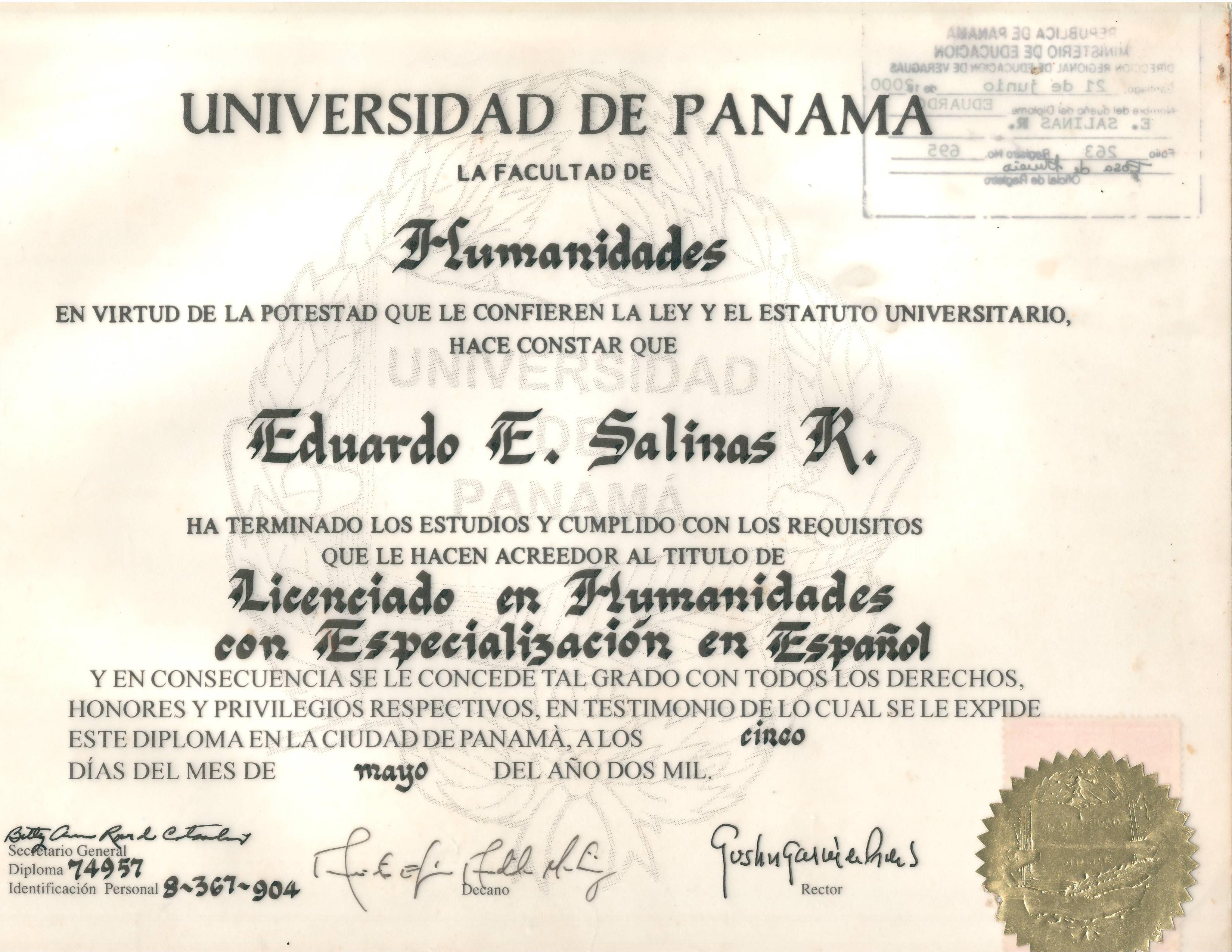 Licenciatura En Humanidades Con Especialización En Español. Profesor De Educación Media Con Especialización En Español, Magister En Educación Superior
