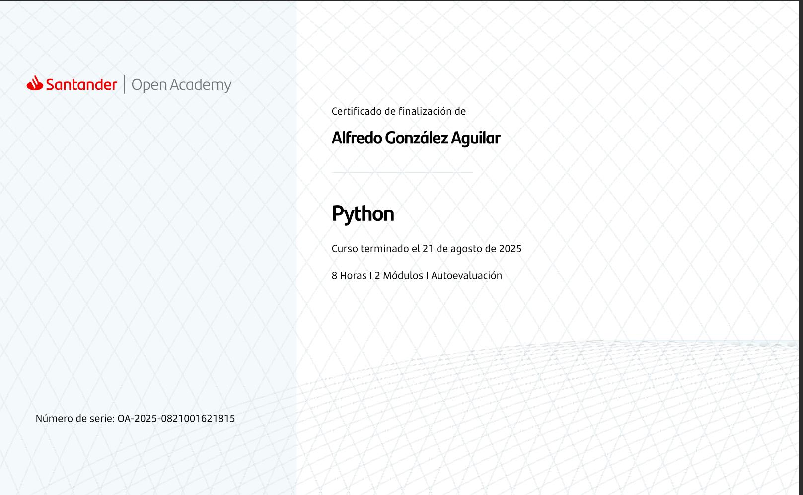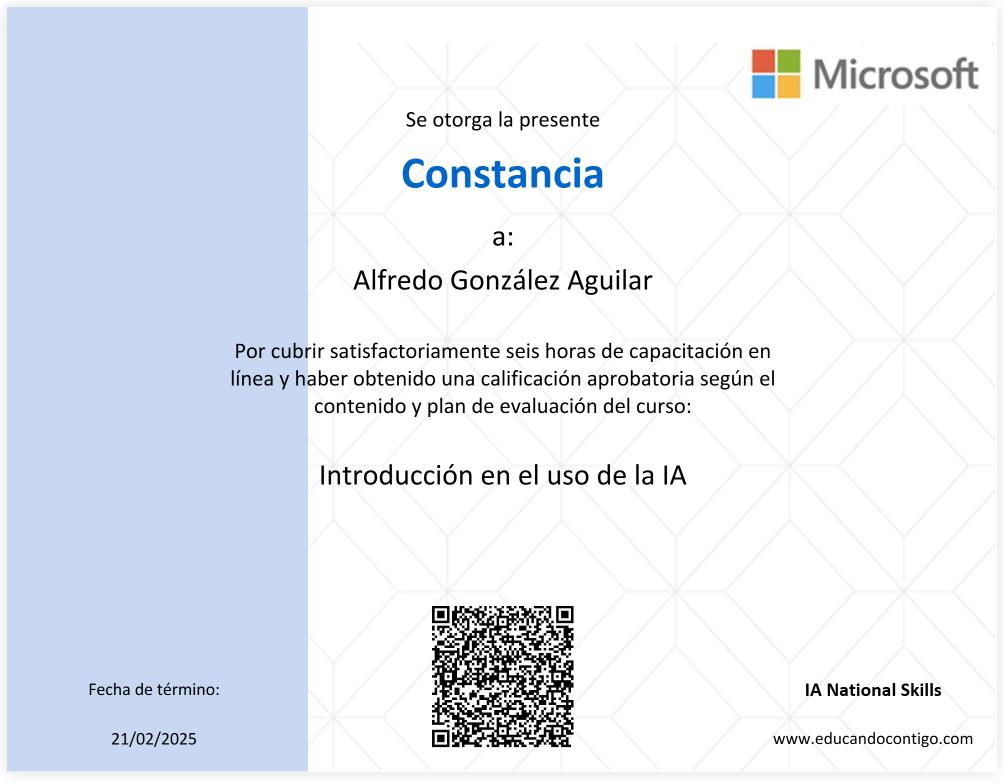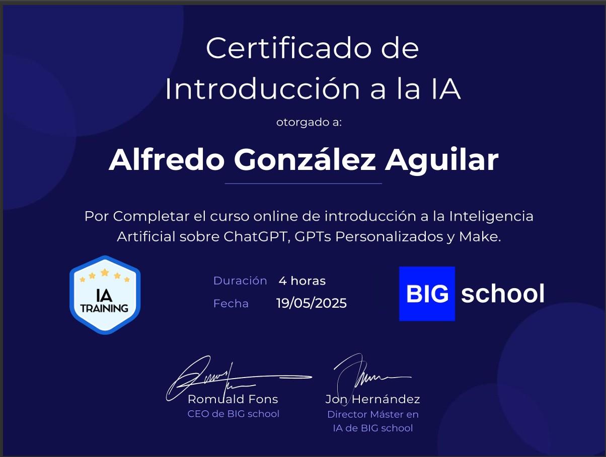 Ya llevo un par de sesiones con el profesor Alfredo González y me ha encantado. Cuando empecé, no tenía experiencia en programación, y Alfredo me organizó un plan de estudio excelente que se cubre muy bien durante las sesiones. Las clases son muy divertidas, dinámicas, y siempre está atento a cualquier duda que pueda surgir. ¡Sin duda lo recomiendo!