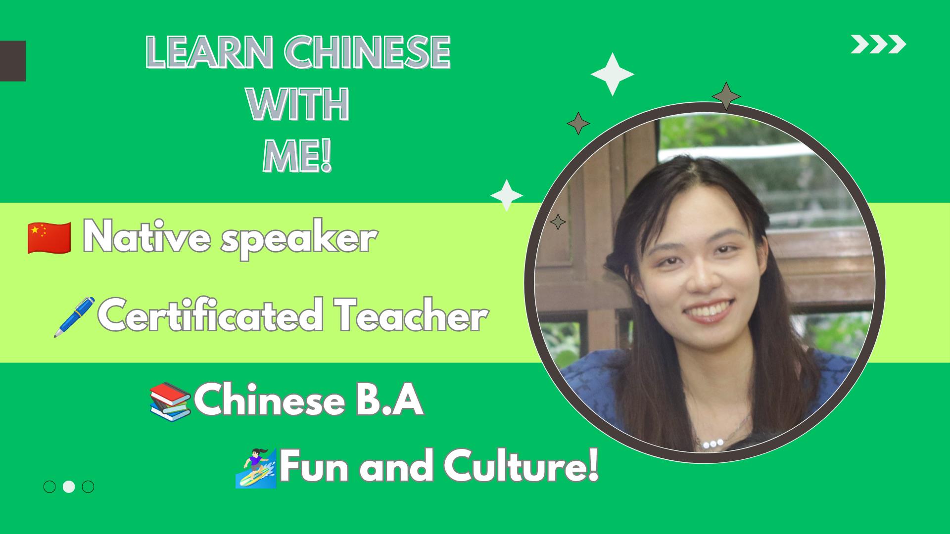 你好!👋Hi there! I'm Yuwei (Rosa), a native Chinese speaker from mainland China. I obtained a Bachelor of Arts degree🎓 in Chinese from Beijing Normal University, one of China’s top universities for teacher education. I hold a High School Chinese Teaching Certificate, Mandarin Level II-A (Standard and fluent pronunciation), and a CET-6 English certificate, which is equivalent to the level of B2 or above. I have two experiences of volunteering in education. I’m confident teaching both beginner and advanced students, and I can explain language points in simple, clear English. With an academic background in Chinese literature and linguistics, I am well-equipped to teach grammar, vocabulary, reading, and writing in a structured yet enjoyable way. I strive to make my classes not only educational but also culturally rich and practical for real-life use. What you can expect🌟 In my class, you won't just learn how to speak Chinese—you’ll experience Chinese culture! I love traditional Chinese stories, classical novels like Journey to the West and Dream of the Red Chamber, popular Chinese novels by MXTX and  Cixin Liu, and modern Chinese TV dramas. If you're interested, we can explore these cultural topics together through language learning. You can: 🗣️Practice real-life conversation and pronunciation 📖Read short stories and decode idioms 🎭Understand the cultural meaning behind everyday expressions 📺Watch Chinese shows and talk about their language and plots ⏳Dive into Chinese history, legends, and philosophy through language Whether you're learning Chinese for school, travel, work, or personal interest, I’ll adapt to your needs. I currently teach teenagers and adults (12+), and welcome curious learners who enjoy discussing culture, language, and ideas. Let’s make learning Chinese something you look forward to!🚀