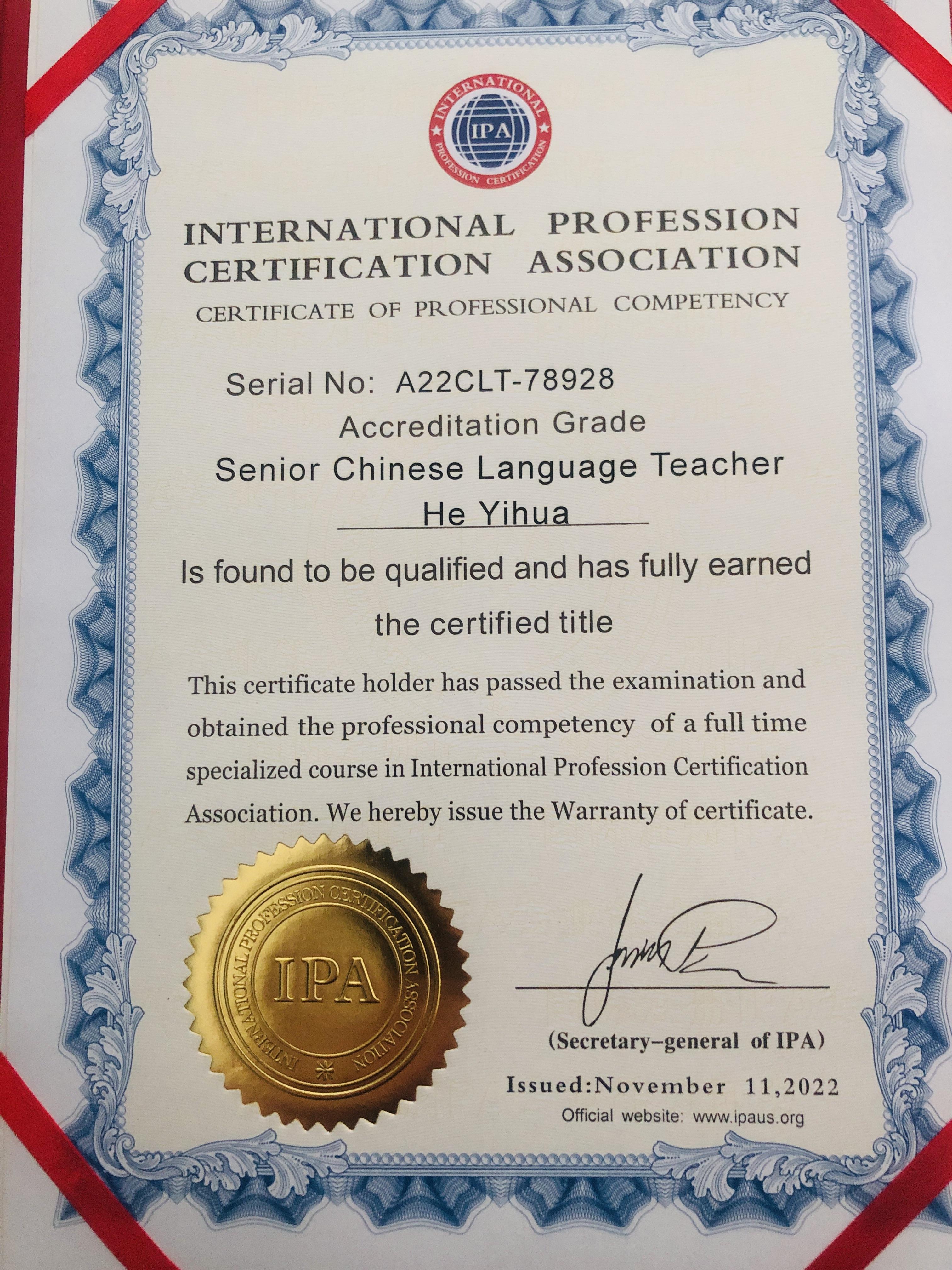 Internation Profession Certification Association-Senior Chinese Languageteacher