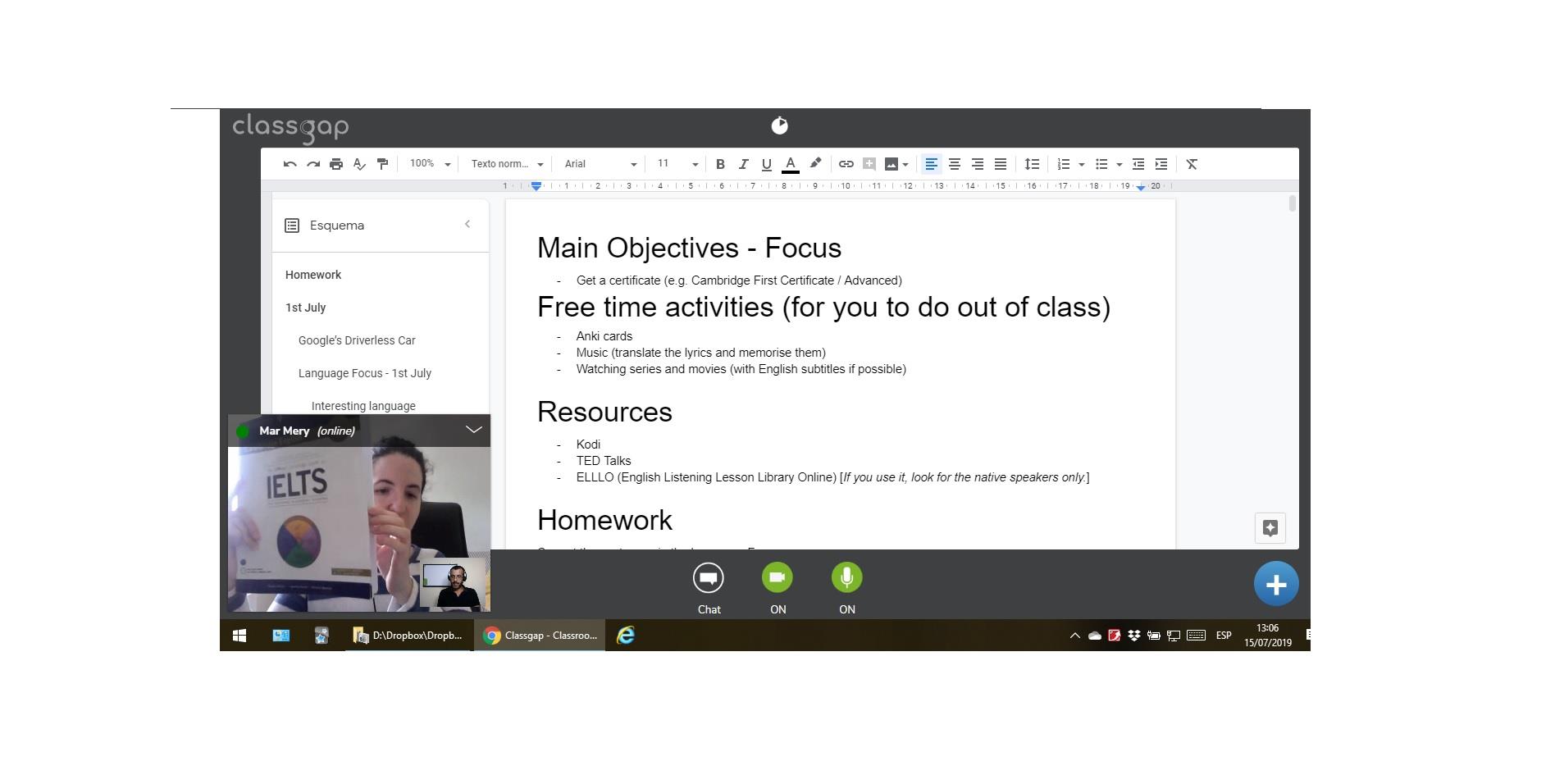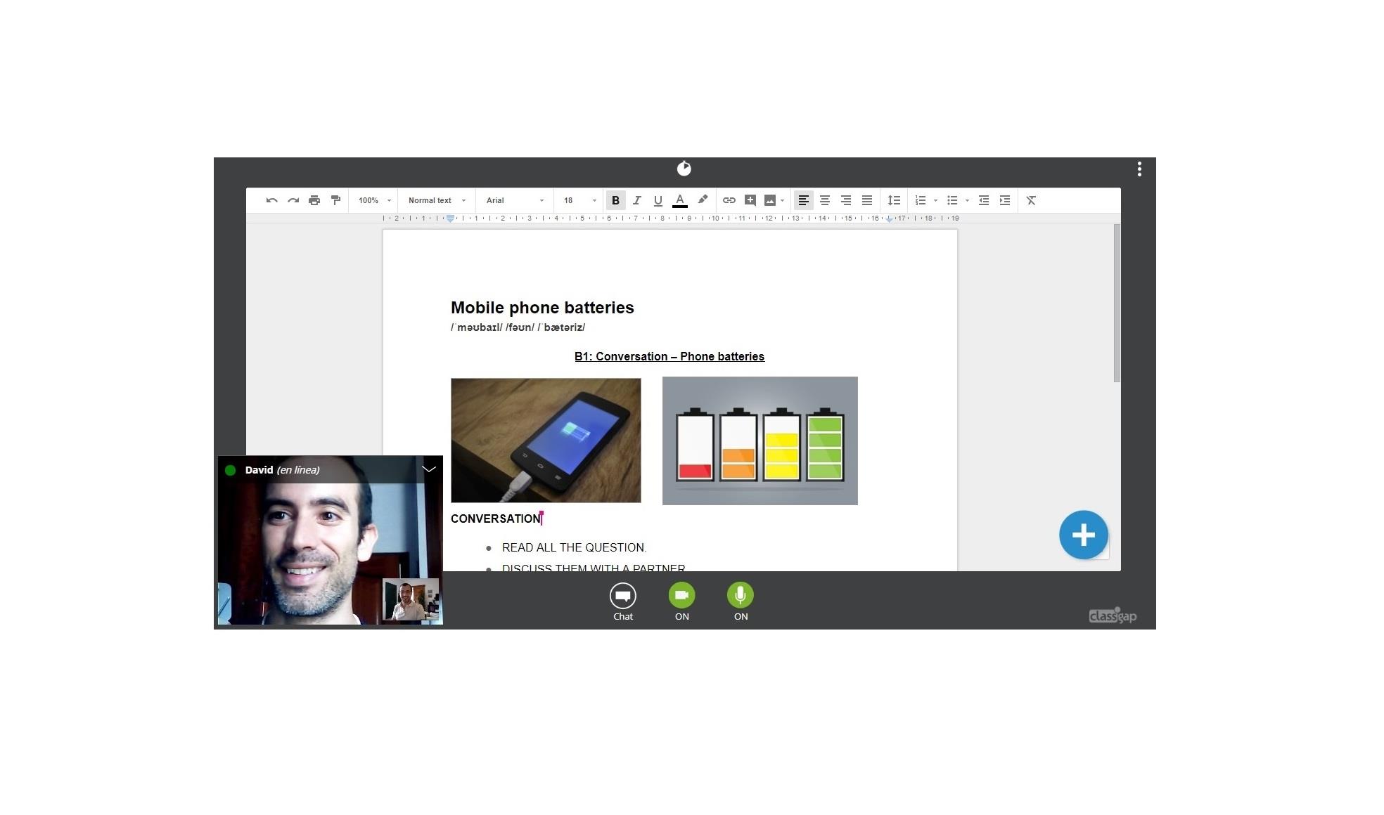 Las clases se realizan en el aula virtual de Classgap, desarrollada para el ámbito formativo con muchas funcionalidades específicas para ello, como el vídeo-chat, la pizarra virtual o el editor de textos a tiempo real. En el siguiente enlace puedes ver una demo del aula y conocerla: Ver aula virtual