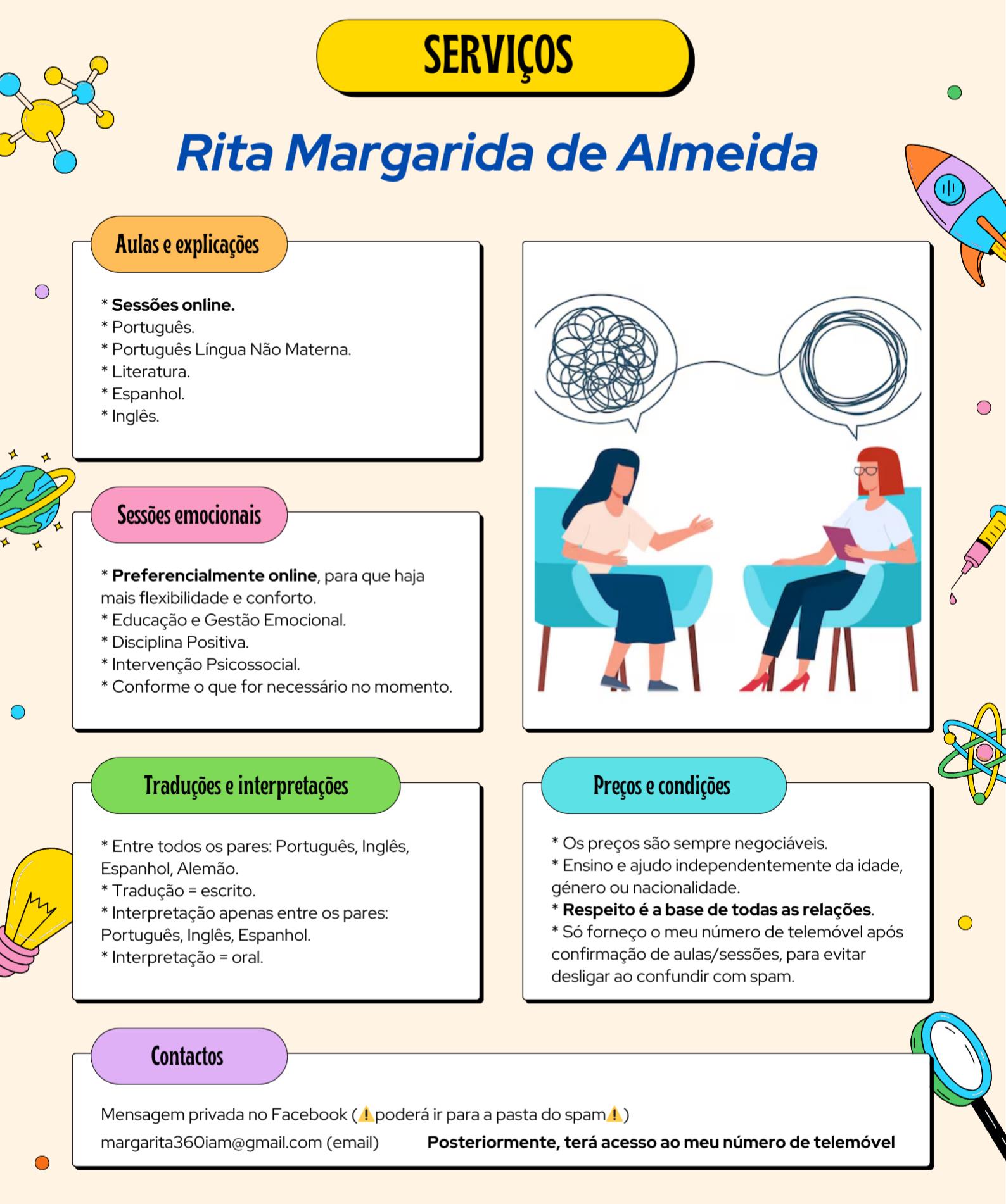Estudo educação emocional, disciplina positiva, intervenção psicossocial e, como é óbvio, tradução e ensino.