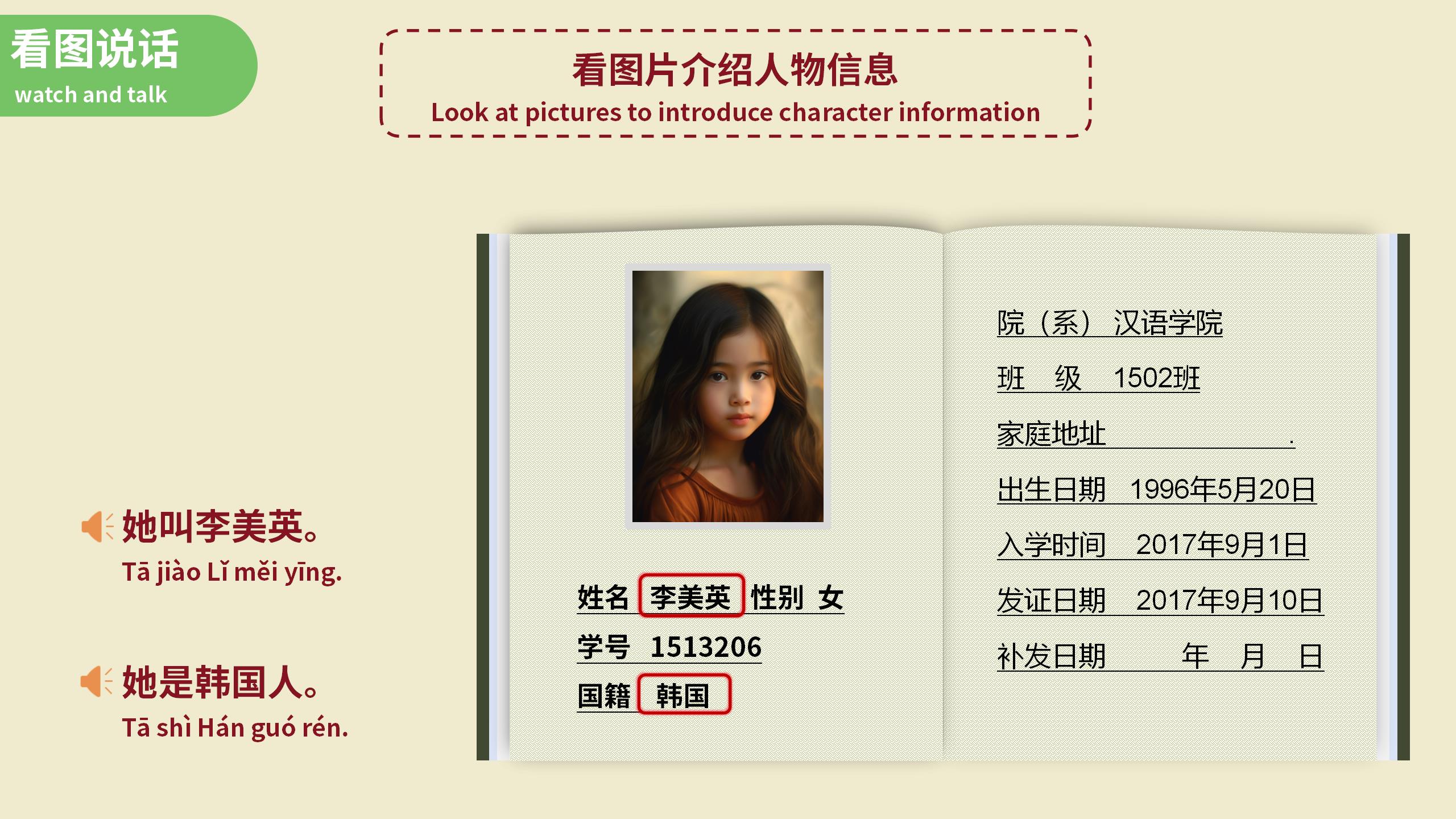 I am cheerful patient and good at encouraging students.I like to be laughed at all the time in the course. I make the students learn Chinese in a relaxed and pleasant atmosphere and complete the course in a variety of games.I have a lot of colorful teaching materials, with the help of teaching materials, I can make the course more perfect.